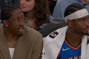 比賽最后時刻,鏡頭給到板凳席上的雷霆眾將,亞歷山大和仍在養傷的杰倫·威廉姆斯神同步。