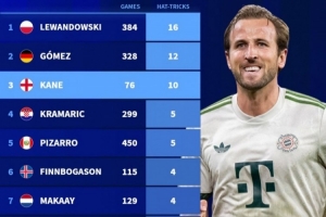 體育資訊12月9日訊 德國轉會市場盤點了21世紀德甲球員帽子戲法次數排名,凱恩10次已經來到第三位。