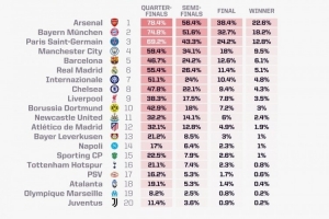 opta本賽季歐冠奪冠概率: