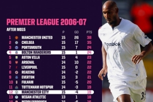 opta列出上一次英超聯(lián)賽第15輪結束后,第4和第12之間的積分差距不超過5分時的積分榜。06-07賽季英超15輪過后,第4博爾頓24分,第12曼城19分,兩隊相差5分。