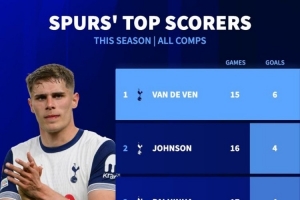 德國轉會市場統計了本賽季熱刺隊內球員的進球數量,并列出榜單,中衛范德芬6球居首。