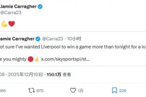 體育資訊12月10日訊 利物浦1-0客勝國(guó)米,卡拉格轉(zhuǎn)發(fā)了賽前談薩拉赫的推文,并配文:拿下!