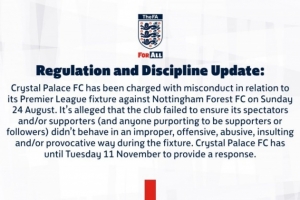 公告內容:“水晶宮足球俱樂部因8月24日對陣諾丁漢森林足球俱樂部的英超聯賽中存在不當行為而受到指控,該俱樂部未能確保其觀眾及/或支持者(以及任何自稱支持者或追隨者的人員)在比賽期間避免采取不當、冒犯性、辱罵性、侮辱性及/或挑釁性行為。”