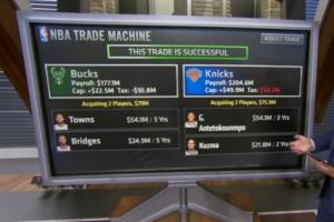 據此,ESPN薪資專家Bobby Marks進行模擬交易,字母哥和庫茲馬去尼克斯,雄鹿得到唐斯和米卡爾·布里奇斯。