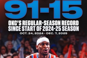 上賽季常規(guī)賽雷霆68勝14負;本賽季至今他們23勝1負。