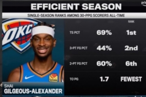 目前亞歷山大場均32.8分4.7籃板6.4助攻1.4搶斷,僅1.7次失誤。
