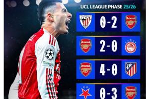 賽后,歐冠官方制作海報曬出了阿森納本賽季的歐冠戰績,槍手6戰全勝僅失1球,共打進17粒進球,還擊敗了馬競、拜仁等強隊。