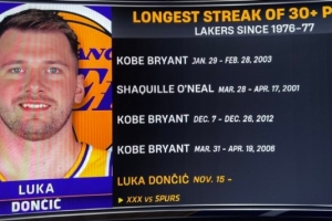 這是東契奇在湖人連續第9場砍30+,自1976-77賽季以來湖人隊史第四長,僅次于科比(16場、10場、9場)和奧尼爾(11場)。