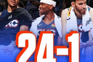 雷霆49分擊潰太陽,隊史最高16連勝,24勝1負開局——輸的那場是背靠背,亞歷山大帶哈騰和三替補。