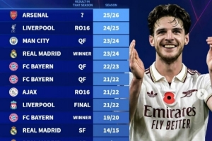 體育資訊12月11日訊 本賽季阿森納在歐冠6戰全勝,德轉也盤點了歐冠歷史前6場全勝球隊最終成績,其中皇馬、拜仁曾拿到冠軍,具體如下: