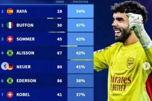 體育資訊12月11日訊 德轉盤點了近10年歐冠門將零封場次占比排行榜(至少25次出場),其中拉亞54%的比賽能夠零封居首,具體如下(比賽場次+零封比例):