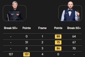 開場舒爾第連下三局,羅伯遜打出137分扳回一城,休息歸來舒爾第連續(xù)打出單桿制勝以5-1取得賽點,隨后羅伯遜連追兩個賽點,第九局舒爾第打出單桿78分制勝。
