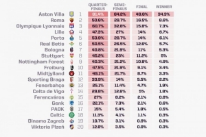 體育資訊12月12日訊 opta在當地時間12月11日對本賽季歐聯杯形勢進行了新的預測,阿斯頓維拉奪冠概率達到34.3%,羅馬8.6%第二。