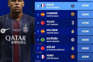 體育資訊11月5日訊 杜埃榮膺2025年金童獎(jiǎng),德轉(zhuǎn)也盤點(diǎn)了足壇U20球員身價(jià)榜,具體如下:
