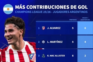 體育資訊12月12日訊 德國轉會市場統計了本賽季阿根廷球員在歐冠的參與進球數量,并列出榜單。