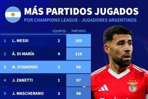 體育資訊12月12日訊 德國轉會市場統計了阿根廷球員的歐冠出場次數,并列出榜單,梅西、迪馬利亞前兩名,奧塔門迪升至第三位。