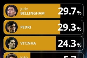 體育資訊12月12日訊 環球足球獎公布了年度最佳中場的投票情況,貝林厄姆居首,佩德里次席。