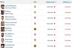 體育資訊12月12日訊 德轉更新西甲身價,跌幅排行中,貝林厄姆、羅德里戈和桑塞特下跌2000萬歐最多。