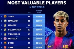 體育資訊12月13日訊 德轉列當前身價排名前十五的球員,亞馬爾、哈蘭德、姆巴佩2億歐并列第一。