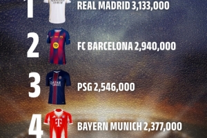 ?? 2025年全球球衣銷量排行(單位:件)