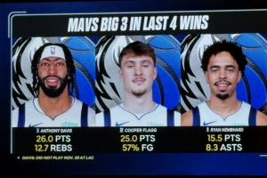 賽前,轉播方給出獨行俠過去4場勝利,濃眉、弗拉格、小納姆哈德三人組的數據: