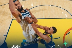 賽后森林狼發布贏球海報,封面人物為戈貝爾,背景則是在內線防守他的庫里。