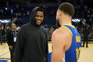 賽后,庫(kù)里和愛(ài)德華茲在場(chǎng)邊寒暄。