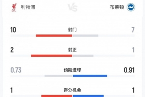 體育資訊12月13日訊 英超第16輪,利物浦主場對陣布萊頓,利物浦半場1-0領先,兩隊上半場數(shù)據(jù)如下(主隊利物浦在前):