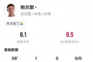 體育資訊12月14日訊 2025-26賽季英超聯(lián)賽第16輪,切爾西主場迎戰(zhàn)埃弗頓。帕爾默首發(fā)出戰(zhàn),1次射門1次射正打進(jìn)1球,送出2次關(guān)鍵傳球,評分8.1。