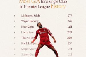 薩拉赫英超中為利物浦直接參與277球(188球,89助),超越魯尼成英超歷史中為單一俱樂部直接參與進球最多的球員。
