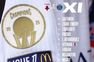 巴黎首發:39-薩福諾夫、33-扎伊爾·埃梅里、6-扎巴爾尼、51-帕喬、21-盧卡斯·埃爾南德斯、17-維蒂尼亞、8-法比安·魯伊斯、47-恩賈恩圖、49-姆巴耶、9-貢薩洛·拉莫斯、19-李剛仁