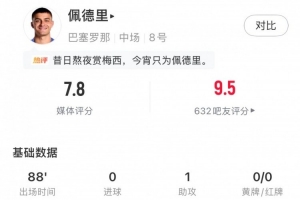 體育資訊12月14日訊 西甲第16輪,巴薩主場2-0擊敗奧薩蘇納,佩德里代表巴薩首發出戰88分鐘,球員本場數據如下: