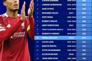 體育資訊12月14日訊 英超第16輪,利物浦在安菲爾德以2-0的比分戰勝布萊頓。本場比賽,紅軍隊長范戴克迎來代表球隊的第150場英超出場,這讓他足以位居隊史第11位。