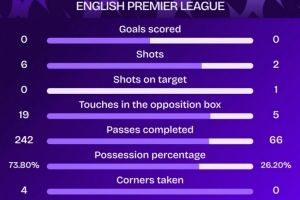 阿森納上半場射門6次,射正0次,這是槍手本賽季英超首次上半場0射正。