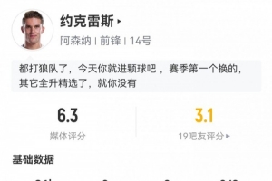體育資訊12月14日訊 本輪英超,阿森納主場暫1-0狼隊。此役約克雷斯首發81分鐘被換下,球員全場重點數據如下↓