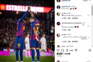 拉菲尼亞賽后更新社媒動(dòng)態(tài),曬出與亞馬爾慶祝進(jìn)球的合照,配文:“LY10 x R11??????????”