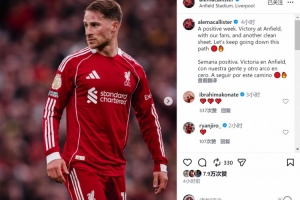 麥卡利斯特社媒曬出比賽照片,配文:“積極的一周,在安菲爾德與我們的球迷一起取得勝利,而且又一次完成零封,讓我們繼續沿著這條道路前進。”
