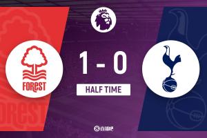 上半場比賽結束,諾丁漢森林1-0熱刺。