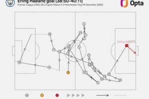 據統計,哈蘭德本場首粒進球經過了球隊25次傳球,曼城上一次在英超通過更多次傳遞破門還是去年5月羅德里對陣西漢姆的進球(31次)。