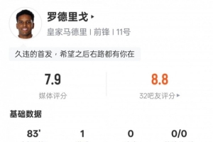 體育資訊12月15日訊 2025-26賽季西甲第16輪,皇馬對陣阿拉維斯,羅德里戈首發出戰,打進1粒進球,1次過人成功,傳球成功率達到96.7%,評分7.9。