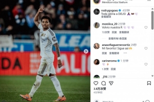 這也是羅德里戈自今年1月首次在西甲破門,賽后他也在個人社媒曬出本場照片,配文寫道:“榮耀歸于上帝!”