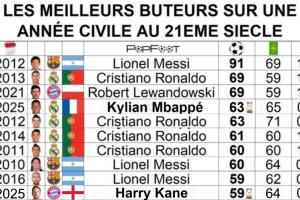在21世紀自然年進球榜上,姆巴佩63球的成績已經超越2012年的C羅來到第4。在2025年皇馬僅剩2場比賽,想達到2013年C羅、2021年萊萬的69球已經幾乎不可能。在這份榜單的榜首,2012年梅西的91球仍遙不可及。