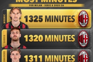 體育資訊12月15日訊 Score90統計了米蘭球員本賽季意甲出場時間,并列出榜單,40歲莫德里奇1325分鐘居首,他僅有25分鐘未在場上。