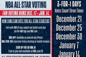 三倍投票日為:12月22日、12月26日、12月31日、1月8日、1月15日,全明星首發名單將于1月20日在NBC公布!