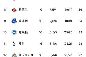 英超第16輪戰罷,前三強與后面的球隊拉開分差。英超從第5(水晶宮)到第15(布倫特福德)之間,僅相差6分。其中第5水晶宮、第6曼聯、第7利物浦、第8桑德蘭同積26分。