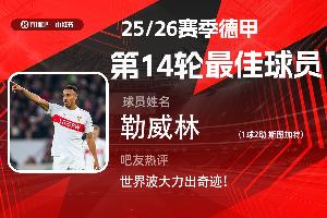 第14輪評選結果出爐,斯圖加特球員勒威林獨造三球,并轟出無解世界波,助球隊大勝不萊梅,獲得吧友超1萬票支持,當選【體育資訊X小紅書德甲第14輪最佳球員】!