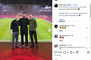 體育資訊12月16日訊 吉魯更新社媒動態,曬出與卡拉格、大衛·瓊斯(天空體育主持人)的合照。