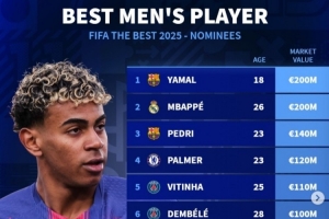 體育資訊12月16日訊 2025年FIFA年度最佳頒獎(jiǎng)典禮將在就卡塔爾多哈舉行,年度最佳球員(世界足球先生)也將揭曉。《轉(zhuǎn)會(huì)市場(chǎng)》也列出了入選提名球員的身價(jià)排行榜,亞馬爾和姆巴佩并列居首。