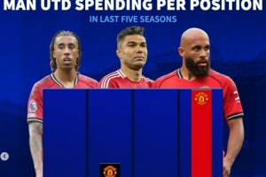 體育資訊12月16日訊 德轉盤點了近5個賽季曼聯在各個位置引援花費情況,其中鋒線引援花費明顯最多,具體如下: