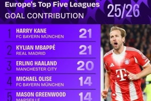 2025-26賽季五大聯賽參與進球(進球+助攻)數據: